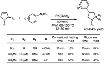 Effective Heck arylations of non-activated N-acyl-3-pyrrolines with arenediazonium salts were accomplished applying microwave irradiation.