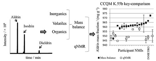 Aldrin mass fraction was determined by mass balance, after determination of impurity mass fractions by gas chromatography with flame ionization detection, gas chromatography-mass spectrometry, gas chromatography with electron capture detector (organics), Karl Fischer coulometric titration (water content), and inductively coupled plasma mass spectrometry (inorganics). The results were validated through the participation of the National Institute of Metrology, Quality and Technology in the key-comparison CCQM-K55.b organized by Organic Analysis Working Group/International Bureau of Weights and Measures.