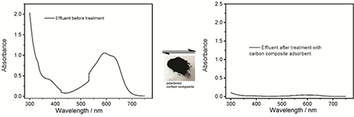 Dye-contaminated effluent treated with carbon composite adsorbent. Left untreated effluent, right treated effluent.