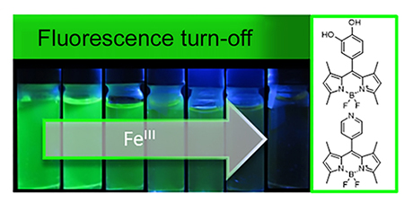Chemical structures of the main borodiazaindacenes (BODIPYs) and the fluorescence turn-off observed under black light for the pyridyl-substituted BODIPY with growing concentration of Fe(III).