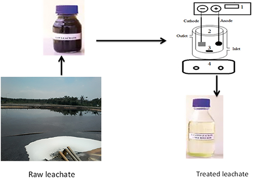 Raw leachate is a complicated sample with high chemical oxygen demand (COD) and color. Hence, a cheap, effective, and easy electrochemical oxidation technique is used in this study to reduce the concentration of pollutants in terms of COD and color.