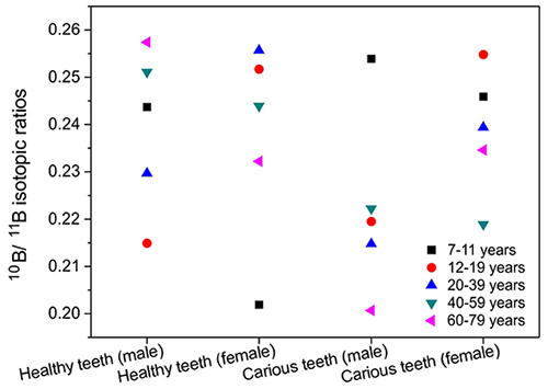 The 10B/11B ratio in the enamel of the healthy teeth and carious teeth fluctuated over a broad range, ranged from 0.2007 to 0.2574. And it has significant variation with respect to age and gender.