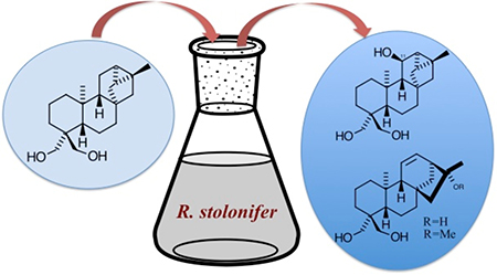 The diterpene ent-18,19-dihydroxytrachylobane was biotransformed by Rhizopus stolonifer, and yielded three new compounds: ent-11β,18,19-trihydroxytrachylobane, ent-16α,18,19-trihydroxykaur-11-ene and ent-18,19-dihydroxy-16α-methoxykaur-11-ene.