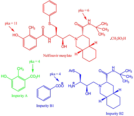 A methodology for the determination of nelfinavir and its impurities was proposed using micellar electrokinetic chromatography (MEKC)-UV. The electrolyte was optimized using mixed-level factorial design. The robustness (using Youden's test) showed that the buffer concentration had the greatest effect in the separation factor.