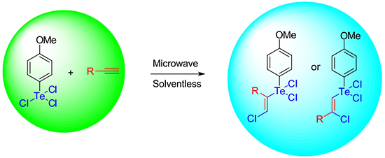 p-Methoxyphenyltellurium trichloride reacts with alkynes in a short reaction time under microwave irradiation in the absence of solvents.