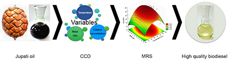 The synthesis process of biodiesel using acid oil (jupati oil), ethanol, and acid catalyst has been optimised employing experimental design and response surface methodology.