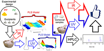 Ultraviolet-partial least squares (UV-PLS) and diffuse reflectance infrared Fourier transform spectroscopy-PLS (DRIFT-PLS) methods for the simultaneous quantification of two veterinary pharmaceutical drugs pyrantel pamoate (PP) and praziquantel (PZ) in commercial tablets and capsules.