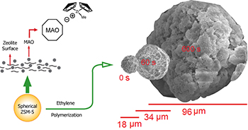 Metallocene was heterogenized on spherical ZSM-5 zeolite and employed in ethylene polymerization reactions.
