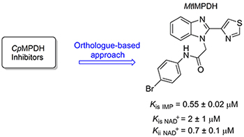 How to cite this articleUsing an orthologue-based approach, we synthesized and assayed a series of thiazolyl-1H-benzo[d]imidazole derivatives as inhibitors of Mycobacterium tuberculosis inosine 5'-monophosphate dehydrogenase (MtIMPDH). From these experiments, a benzo[d]imidazole compounds was described to inhibit the enzyme in the low micromolar range, which places this compound among the most potent in vitro MtIMPDH inhibitors developed to date. Details are presented in the Article Synthesis and Evaluation of Thiazolyl-1H-benzo[d]imidazole Inhibitors of Mycobacterium tuberculosis Inosine Monophosphate Dehydrogenase by Kenia Pissinate, Diana Carolina Rostirolla, Laura de Miranda Pinheiro, Priyanka Suryadevara, Perumal Yogeeswari, Dharmarajan Sriram, Luiz Augusto Basso, Pablo Machado, and Diógenes Santiago Santos on page 1357.