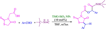 The efficient synthesis of novel rhodanine-based amide derivatives via Passerini reaction using tetramethylguanidine-functionalized silica nanoparticles as a reusable heterogeneous base catalyst, and the antibacterial activity of the synthesized compounds are described.