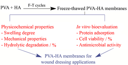 Stepwise design and discussed bio-evaluations of poly(vinyl alcohol)-hyaluronic acid (PVA-HA) hydrogel membranes for wound dressing applications.
