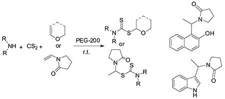 Synthesis of dithiocarbamates by Markovnikov addition reaction in polyethylene glycol (PEG) and their application in amidoalkylation of naphthols and indoles is reported in this manuscript.