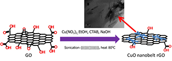 One pot synthesis of CuO nanobelt decorated graphene oxide (GO) as well as conversion to CuO nanobelt decorated reduced GO (rGO) and used for electrochemical sensing of glucose has been reported.