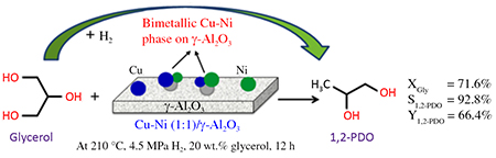 Cu-Ni(1:1)/γ-Al2O3 catalyst exhibited a maximum glycerol conversion of 71.6% with 92.8% selectivity to 1,2-propanediol at 210 °C and 4.5 MPa hydrogen pressure. The superior performance was attributed to the strong interaction between Cu and Ni, small particle size, and high acidic strength of the catalyst.