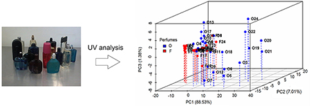 A method for detecting adulteration in perfumes by ultraviolet (UV) spectroscopy and multivariate analysis is proposed. Classification of perfumes was accomplished with spectroscopic data using chemometrics analysis techniques such as principal component analysis (PCA), soft independent modeling of class analogy (SIMCA) and linear discriminant analysis (LDA).