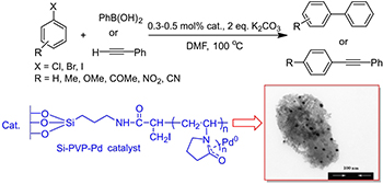 Palladium nanoparticles supported on polyvinylpyrrolidone grafted silica was prepared. The catalyst exhibited excellent activity in Sonogashira and Suzuki coupling reactions.