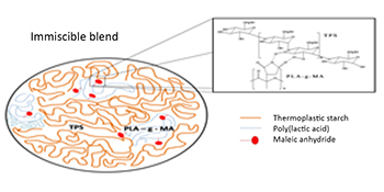 Immiscible thermoplastic starch/poly(lactic acid) grafted with maleic anhydride (TPS/PLA-g-MA) blend and in detail the hydrogen bond between the TPS matrix and PLA-g-MA domains, due to the use of MA as a compatibilizer.