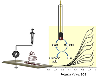 Copper oxide nanofibers synthesized by electrospinning technique and subsequent thermal treatment, were used to modify paraffin-impregnated graphite electrode for a sensitive non-enzymatic glucose detection.