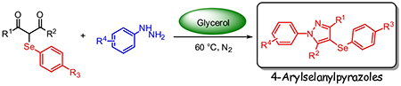 We describe here a simple method to synthesize 4-arylselanylpyrazoles by reaction of α-arylselanyl-1,3-diketones with arylhydrazines using glycerol as solvent at 60 °C under N2 atmosphere. This is a direct cyclocondensation reaction performed with α-arylselanyl-1,3-diketones and arylhydrazines bearing electron-withdrawing and electron-donating groups affording the corresponding 4-arylselanylpyrazoles in moderate to good yields.