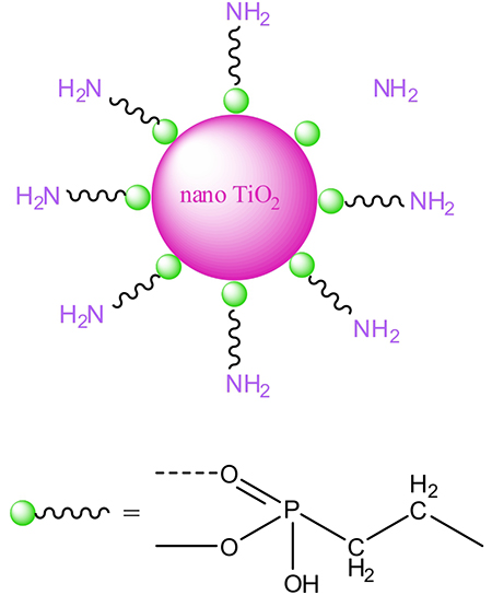 Amino functionalization of nano TiO2 particles with monoester phosphate through strong covalent interactions.