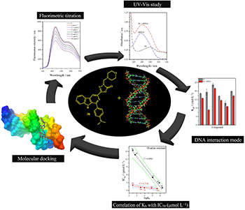 This work reports the interaction evaluation of twelve β-carboline derivatives with deoxyribonucleic acid (DNA) using spectroscopic techniques, correlation of binding constants (Kb) with IC50 of seven human cancer cell lines and molecular docking.