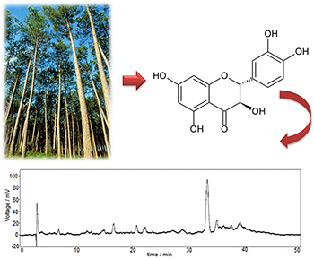 Taxifolin is the major individual polyphenol in the aqueous extract of the bark of Pinus pinaster and may be a chemical marker for quality control of this extract. It was analyzed by reversed phase liquid chromatography with photodiode array detector.