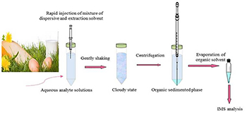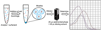 For the extraction of analytes, salt solution is added to the aqueous sample to form micelles. After centrifugation, enriched micellar phase is dissolved in a diluting solvent and was transferred to a microcell for spectrophotometric determination.