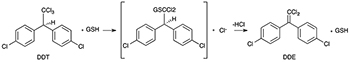 How to cite this articleGlutathione S-transferase (GST) catalyzes the conjugation of the reduced form of glutathione (GSH) to xenobiotic substrates, leading to their excretion. This is an important mechanism in insect-resistance to dichloro-diphenyl-trichloroethane (DDT). Molecular docking calculations positions the DDT beta-carbon for the nucleophilic addition by the thiolate group in GSH. This reaction converts DDT to dichloro-diphenyl-dichloroethylene (DDE). Punctual mutation on position 120 in GST Epsilon class isoforms from Anopheles gambiae influences the conformational dynamics of protein strengthening the reaction capabilities to consume DDT. Details are presented in the Article The Role of the Conformational Dynamics of Gluthatione S-Transferase Epsilon Class on Insecticide Resistance in Anopheles gambiae by Frederico J. S. Pontes, Rafael T. Maia, Maria Carolina P. Lima, Constância F. J. Ayres and Thereza A. Soares on page 1602.