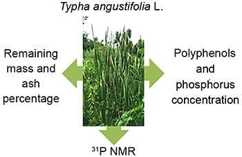 The degradation of Typha angustifolia L. is accompanied by the remaining mass and ash percentage showing the liberation of polyphenols and phosphorous compounds from lignocellulosic tissue, which consequently generates humic substances. Different phosphorous compounds were identified in the remaining mass by 31P NMR (nuclear magnetic resonance).