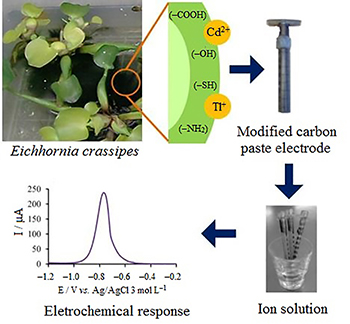 In this work carbon paste electrodes modified with Eichhornia crassipes roots were employed to study the adsorption of thallium (Tl+) and cadmium (Cd2+) ions. Ions interact with different functional groups that are present in the roots. Eichhornia crassipes is an effective alternative for the removal of Tl+ and Cd2+ ions from an aqueous medium.