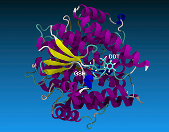 Glutathione S-transferase (GST) catalyzes the conjugation of the reduced form of glutathione (GSH) to xenobiotic substrates, leading to their excretion. This is an important mechanism in insect-resistance to dichloro-diphenyl-trichloroethane (DDT). Molecular docking calculations positions the DDT beta-carbon for the nucleophilic addition by the thiolate group in GSH. This reaction converts DDT to dichloro-diphenyl-dichloroethylene (DDE). Punctual mutation on position 120 in GST Epsilon class isoforms from Anopheles gambiae influences the conformational dynamics of protein strengthening the reaction capabilities to consume DDT. Details are presented in the Article The Role of the Conformational Dynamics of Gluthatione S-Transferase Epsilon Class on Insecticide Resistance in Anopheles gambiae by Frederico J. S. Pontes, Rafael T. Maia, Maria Carolina P. Lima, Constância F. J. Ayres and Thereza A. Soares on page 1602.