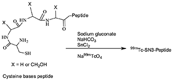 We optimized radiolabeling cysteine-based peptides with technetium-99m (99mTc). In this study, the effect of experimental parameters in the labeling procedure such as type of buffer solutions, pH of media, and type of exchange ligands were optimized toward obtaining maximum labeling yield.