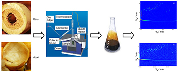 This study is the first report on the analysis of bio-oil from baru and acuri. The samples produced bio-oils with different compositions.