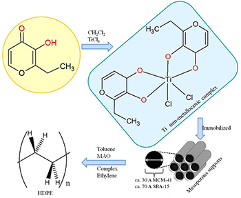 A new post-metallocene-Ti catalyst with ethylmaltol ligand was synthesized and characterized. This complex was immobilized on different mesoporous supports and investigated in ethylene polymerization reaction giving high density polyethylene.