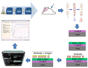 Production and purification of recombinant protein/immunization of rabbit and antibody purification/immobilization of antibody on sensor chip/interaction of bacteria with immobilized antibody/analyzing of responses.