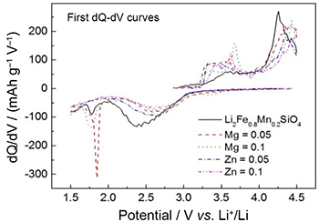 After the co-doping result in the increasing area of oxidation peak around 3.5 V. At the same time, a shift of reduction peak at 2.5 V towards the right means less internal polarization.