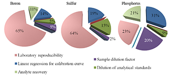 Relative contribution of each factor to the total uncertainty in the determination of boron, phosphorus and sulfur in mineral fertilizer by inductively coupled plasma optical emission spectrometry.