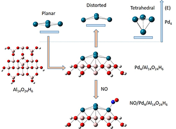 Distortion of Pd4 promoted by γ-alumina cluster (top) and preferential site for adsorption of NO on Pd4/Al14O24H6 (bottom).