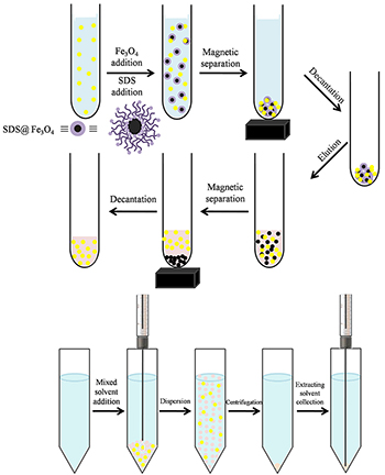 A mixed-hemimicelles (MHSPE) method coupled with dispersive liquid-liquid microextraction (DLLME) for the isolation and determination of amphetamines from biological samples is developed based on the use of sodium dodecyl sulfate (SDS)-coated Fe3O4 nanoparticles prior to the high performance liquid chromatography (HPLC-UV) analysis.