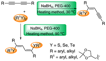 The selective synthesis of (Z)-chalcogenoenynes and (Z,Z)-1,4-bis-chalcogenbuta-1,3-dienes is presented here.