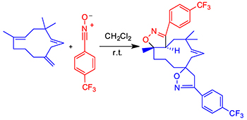 High regio- and site selectivity of [2 + 3] dipolar cycloaddition reaction of 4-trifluoromethylbenzonitrile oxide to C15 sesquiterpene was observed