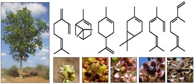 GC-MS and NMR analyzes of the essential oil from leaves of 62 individual specimens of Myracrodruon urundeuva ("aroeira-do-sertao") permitted to identify six different chemotypes characterized by the major constituents: myrcene, α-pinene, limonene, Δ3-carene, and (Z) and (E)-β-ocimene.