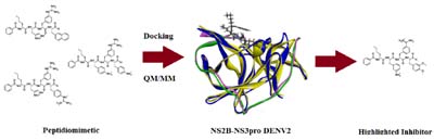 Peptidomimetics were considered as inhibitor candidates for NS2B-NS3pro DENV-2. Molecular docking and QM/MM calculations were used to evaluate these various compounds. Ligand Bz-Nle-m(Am)Phe-m(Im)Phe-(dMo)Phe-H was found to be the best inhibitor candidate for this molecular template. These findings may motivate additional virtual screening based on the pharmacophoric hypothesis to characterize lead compounds for therapies targeted against DENV.