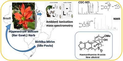 Typical Amaryllidaceae alkaloids have been identified from Hippeastrum aulicum by means of capillary gas chromatography-mass spectrometry (CGC-MS). Leaf and paper spray mass spectrometry were carried out and the results obtained were in agreement with CGC-MS data. NMR data for the new compound haemanthamine N-oxide are also reported.