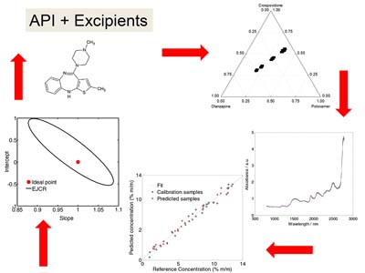Active principle of olanzapine in different pharmaceutical excipients using near infrared spectroscopy (NIRS) and multivariate calibration was developed.