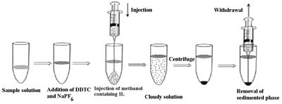 To the sample solution, appropriate amounts of DDTC (complexing agent) and NaPF6 were added. After standing for 2 min, 0.5 mL methanol containing 0.13 IL was injected rapidly. After centrifuging, extraction phase was mixed with 500 µL methanol prior to the flame-AAS analysis.