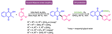 Suzuki-Miyaura cross coupling reaction between 2-hydroxy-3-iodonaphthalene-1,4-dione and a series of arylboronic acids/esters followed by OH-protection as the corresponding N,N-diethyl carbamates is reported. The synthesized compounds were evaluated regarding their antineoplastic and antileishmanial activities furnishing promising results.