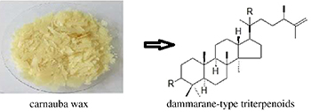Sixteen dammarane-type triterpenoids, including thirteen new, were identified from carnauba (Copernicia prunifera) wax (types 1 and 4).