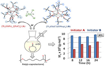 Complexes [Ti3(OiPr)11][FeCl4] and [Ti3(O)(Cl)(ONep)9] were employed as initiators for the polymerization of ε-caprolactone (ε-CL). The better polymerization reactivity of [Ti3(O)(Cl)(ONep)9] seems to be associated with the maintenance of its polynuclear structure in the reaction mixture.