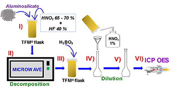 Microwave-assisted acid decomposition using closed vessels was applied to aluminosilicates in order to quantify Na and Al, reducing the time consumed for samples preparation step. This procedure avoided analytes losses and contamination.